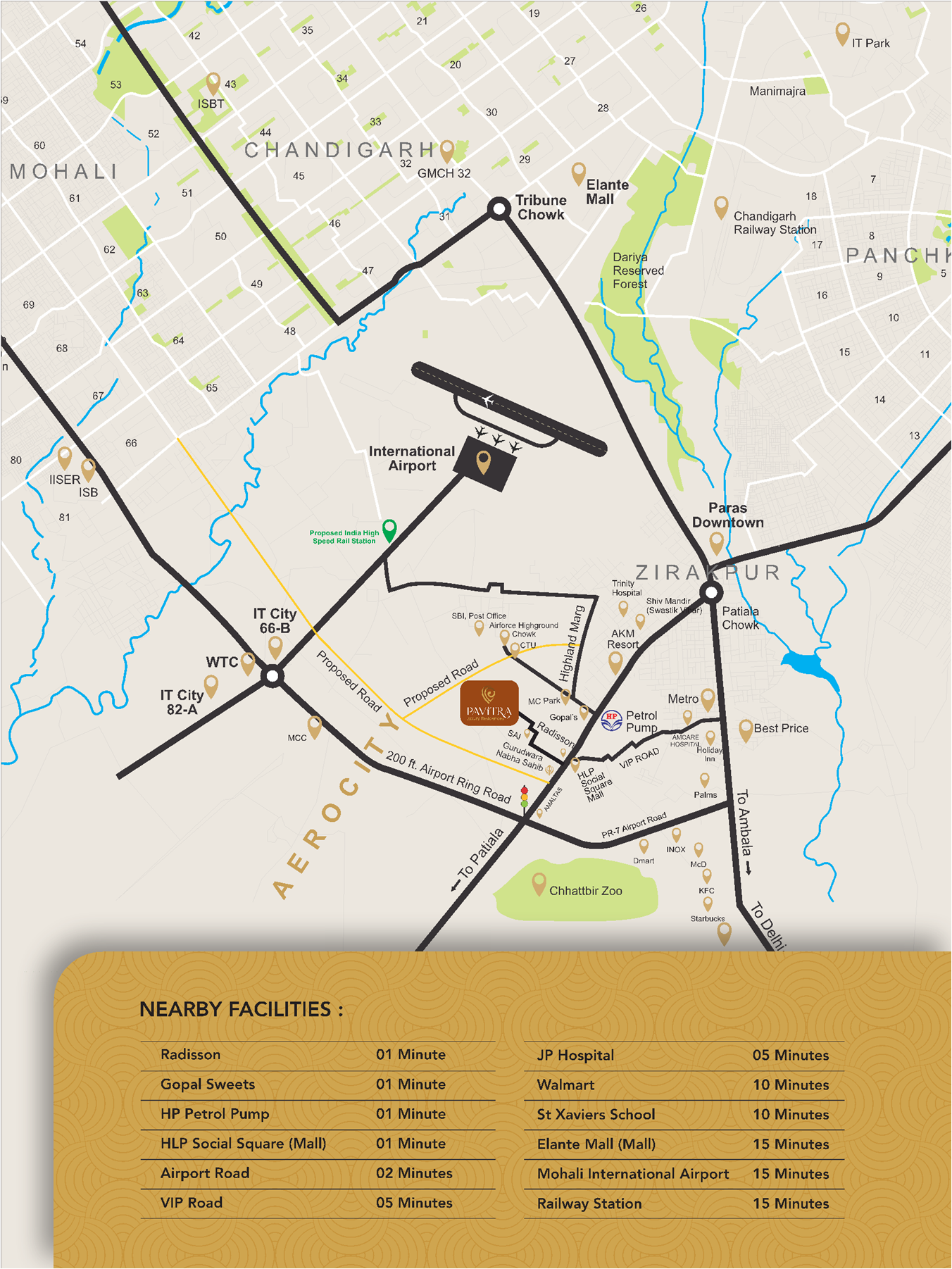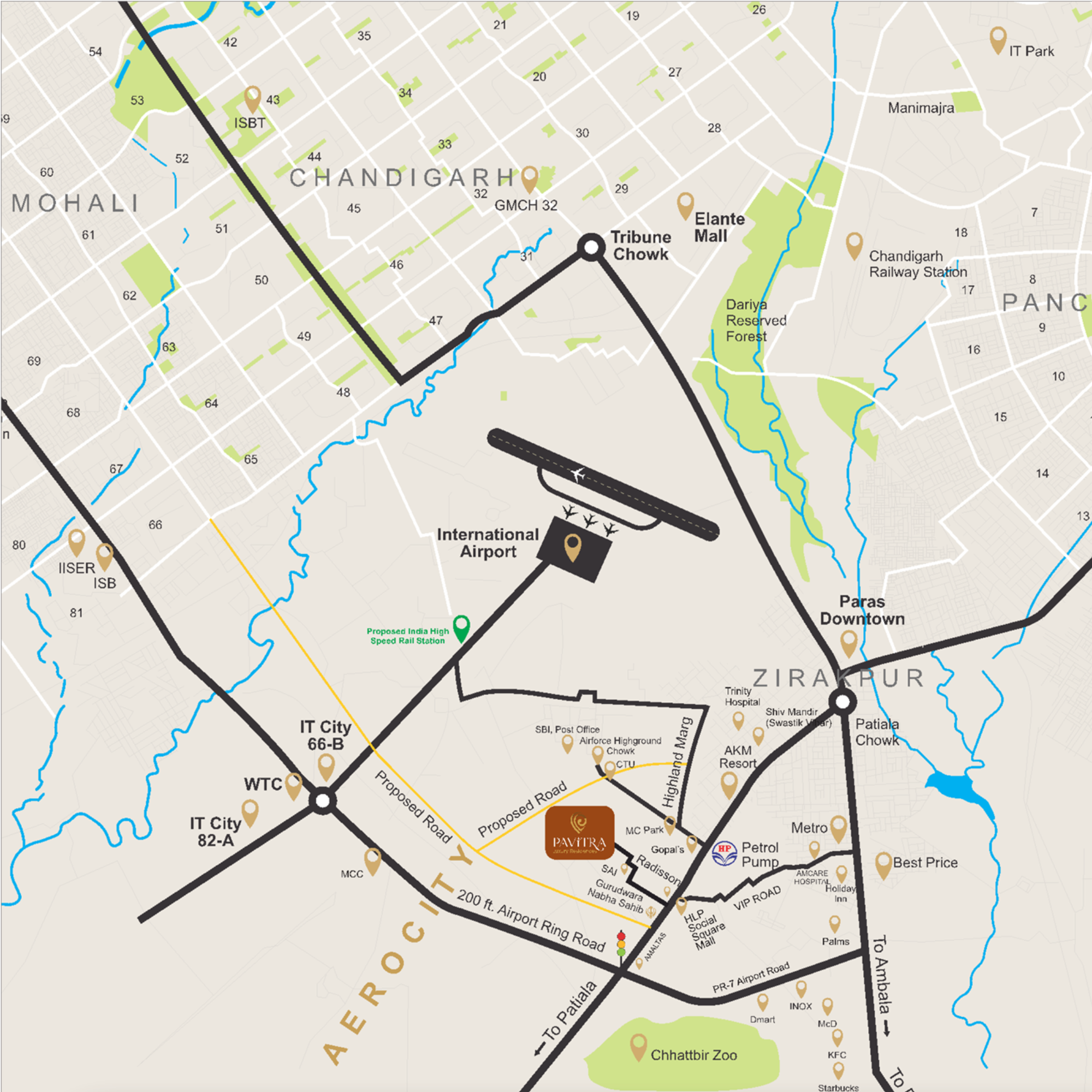The property is located in a prime and well-connected area with easy access to Airport Road and VIP Road. Major landmarks such as hotels, malls, hospitals, schools, and daily conveniences are just minutes away. Excellent connectivity to Mohali International Airport and the Railway Station makes this location ideal for both comfortable living and smart investment.